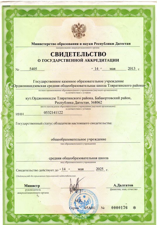 | Полное наименование образовательной организации* | Государственное казенное общеобразовательное учреждение Республики Дагестан "Орджоникидзевская основная общеобразовательная школа Тляратинского района" |